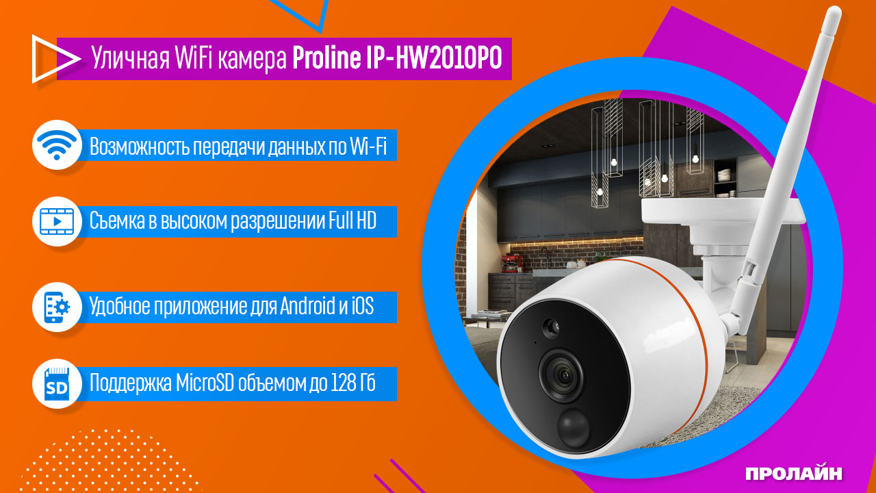 Proline IP-HW2010PO - представляет собой Wi-Fi камеру с поддержкой двусторонней связи. Подключение и управление производится через приложение «IP Pro3» для смарт-устройств на базе Android и iOS. Запись и хранение видео осуществляется на MicroSD-карту памяти объемом до 128 Гб. Влагозащищенный корпус выполнен в соответствии с классом IP66 - полная защита от пыли и направленных струй воды. Благодаря защищенному корпусу и широкому диапазону рабочих температур камера видеонаблюдения может устанавливаться на улице, а встроенная инфракрасная подсветка позволяет вести съемку и в темное время суток. Также камера оснащена PIR-датчиком движения. Запись видео может производится как по движению, так и непрерывно.