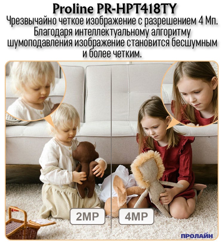 Поворотная камера видеонаблюдения Proline PR-HPT418TY с беспроводным подключением через WiFi на частоте 2.4ГГц и 5 ГГц или встроенный порт RG45, позволяет вести наблюдение и запись на карту памяти формата microSD до 128 Гб (в комплект не входит). Видеокамера имеет поворотный механизм, блягодаря которому возможно удаленное управление поворотом камеры по горизонтали на 355° и наклоном по вертикали на 90°. Это обеспечивает расширенную зону наблюдения за объектом. Видеокамера оснащена сенсором 1/2.7" GalaxyCore GC2033 и довольно производительным микропроцессором Goke GK7102, обеспечивающие вместе трансляцию и запись видео с разрешением FullHD c компрессией Smart H.265. Для работы в темное время суток Proline PR-HPT418TY использует инфракрасную подсветку с 6 LED диодами с дальностью до 10 метров. Камера обладает интеллектуальной системой слежения за движением человека. При возникновении движения в обзоре камеры, она начинает слежение, поворачиваясь по горизонтали и вертикали, и преследуя объект. Это позволяет получать более информативную картинку происходящего на объекте слежения и не требует установки дополнительных видеокамер. Данная поворотная WiFi видеокамера будет полезна для слежения за престарелыми, людьми с ограниченными возможностями, а также в качестве видеоняни для слежения за детьми. Благодаря двусторонней аудиосвязи можно общаться с детьми и престарелыми взрослыми.