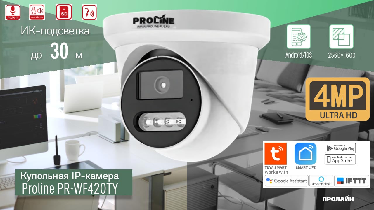 Купольная TUYA Wi-Fi IP-видеокамера Proline PR-WF420TY это высококачественная антивандальная купольная видеокамера, выполнена в прочном корпусе и предназначена для наружного монтажа. Цифровое устройство способно вести съемку в формате высокого разрешения Ultra HD 1600P. Передача видеосигнала осуществляться через LAN или с беспроводным подключением через WiFi на частотах 2.4 ГГц и 5 ГГц, позволяет вести наблюдение и запись на карту памяти формата microSD до 128 Гб (в комплект не входит). Видеокамера Proline PR-WF420TY оснащена фиксированным объективом с фокусным расстоянием 2.8 миллиметра и благодаря возможности настройки угла положения объектива, расположенного под куполом, вы всегда сможете настроить камеру таким образом, чтобы она захватывала необходимую часть контролируемого объекта. Максимальное разрешение, поддерживаемое видеоустройством равно 4 Мп 2560×1600 пикселей. Соответствие стандарту ONVIF обеспечивает большую гибкость при проектировании системы IP-видеонаблюдения. Просмотр изображение и настройку камеры можно осуществить через браузер или программу для PC. Данное программное обеспечение поддерживается как ПК, так и смарт устройствами, работающими на базе Android и iOS.