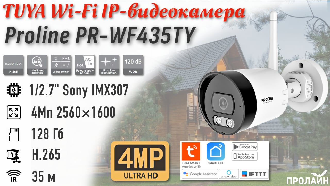 Камера исполнена в прочном корпусе с классом защиты IP66 (полная защита от пыли и водяных струй). Съемка в темное время суток возможно благодаря встроенным инфракрасным светодиодам, дальность подсветки которых составляет 30-35 метров в зависимости от погодных условий. Фокусное расстояние объектива составляет от 3,6 миллиметров. Для удаленного доступа к камере можно использовать проводное подключение через разъем RJ45 (10/100M Base-T) или беспроводное подключение WiFi 2.4ГГц и 5 ГГц. Используя смартфон или планешет можно не только просматривать видео с камеры, но и осуществлять двусторонний аудио переговор, благодаря встроенному микрофону и динамику. Беспроводная видеокамера Proline PR-WF435TY поддерживает мобильное приложение TuyaSmart, объединяющее в себе управление умными устройствами и безопасность вашего дома. При подключении к беспроводному роутеру с выходом в интернет, возможно получать уведомления, наблюдать и управлять видеокамерой из любой точки, при помощи смартфона или планшета на Android или iOS, также подключенного к сети интернет с установленным облачным сервисом от TuyaSmart.