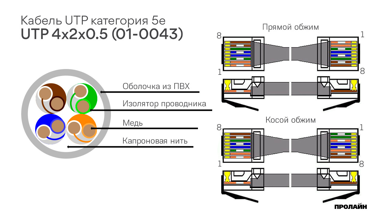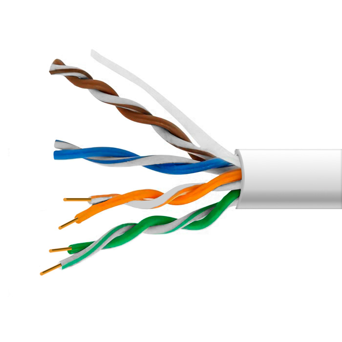 Кабель обеспечивает передачу цифровых сигналов в диапазоне частот, соответствующих категории 5e. Носит общее название "витая пара" из-за попарного переплетения кабелей под защитной оболочкой. Используется 4 пары, всего 8 проводов. Для эффективного использования всех каналов необходимо обжимать UTP 4x2x0.5 с использованием штекерного разъема RJ-45 8Р8С, цвет провода с одной стороны должен соответствовать цвету с другой стороны. Обычно монтажники используют одну согласованную схему обжима в рамках одной компании, например общепринятые 568A или 568B.
