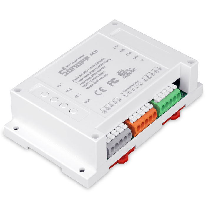 Умный 4-х канальный Wi-Fi выключатель Sonoff 4CH - это новейшее устройство от компании Sonoff, вобравшее в себя весь функционал предыдущей продукции компании, а также получившая ряд улучшений. Выключатель создан на базе чипа ESP8285 и в отличии от младших моделей, способен управлять 4-я устройствами одновременно, с помощью кнопок на приборе, либо из любой точки мира посредством специального программного обеспечения eWeLink для Android/iOS. Программа позволяет просматривать текущий статус каждого устройства по отдельности, производить их включение/выключение, создавать до 8 сценариев событий, устанавливать таймер и многое другое. Корпус устройства выполнен из огнезащитного ABS пластика и позволяет устанавливать Sonoff 4CH на DIN-рейку благодаря специальным крепежам. Выключатель поддерживает максимальную мощность на одну группу до 2200 Вт, при общей нагрузке на все устройства до 3500 Вт. Максимальная сила тока же на группу не должна превышать 10А, а на устройство в целом 16А.