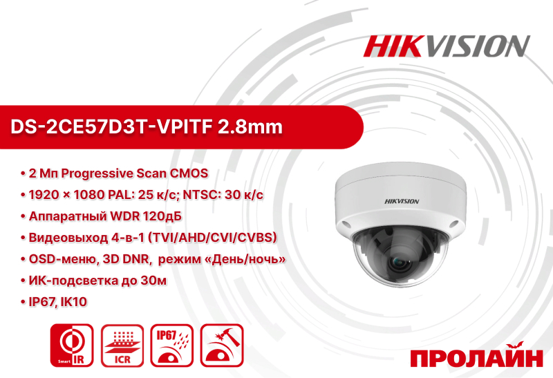 Уличная HD-TVI камера Hikvision DS-2CE57D3T-VPITF снабжена объективом 2.8 mm и матрицей 2 Мп. Достоинством модели является высокая чувствительность, а также способность эффективно работать в условиях плохого освещения и даже в полной темноте. Устройство снабжается качественной EXIR-подсветкой и интеллектуальной ИК-подсветкой, действующей на расстоянии до 30 м. Металлический корпус купольного типа хорошо защищен от попадания влаги и пыли по протоколам IP67, IK10. Камера способна работать в температурном диапазоне от -40 до + 60 °C и влажностью до 90%.