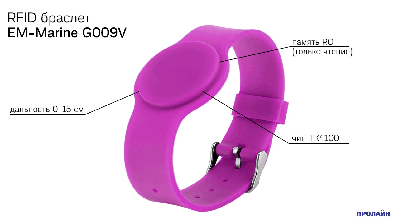 Внутри G009V находится специальная микросхема, которая выполняет роль приёмника, передатчика и антенны. Заранее прошитый код считывается с расстояния до 15 см, затем сверяется с базой данные и если он там прописан выполняется назначенное действие, например, открывается турникет. Считыватель генерирует магнитное поле частотой 125 кГц. В магнитном поле идентификатор получает энергию и начинает циклически модулировать магнитное поле считывателя сигналом, в котором зашифрован её идентификационный код. Никаких элементов питания внутри самого браслета не нужно, данные ключа на нём нельзя изменить или стереть. Таким образом, чтобы устройство перестало работать необходимо физически повредить надежно защищенную микросхему, что делает эксплуатацию таких меток очень удобной и надёжной альтернативой любому другому способу идентификации. Область применения EM-Marine очень разнообразна, кроме того существую версии с перезаписываемой памятью RW.