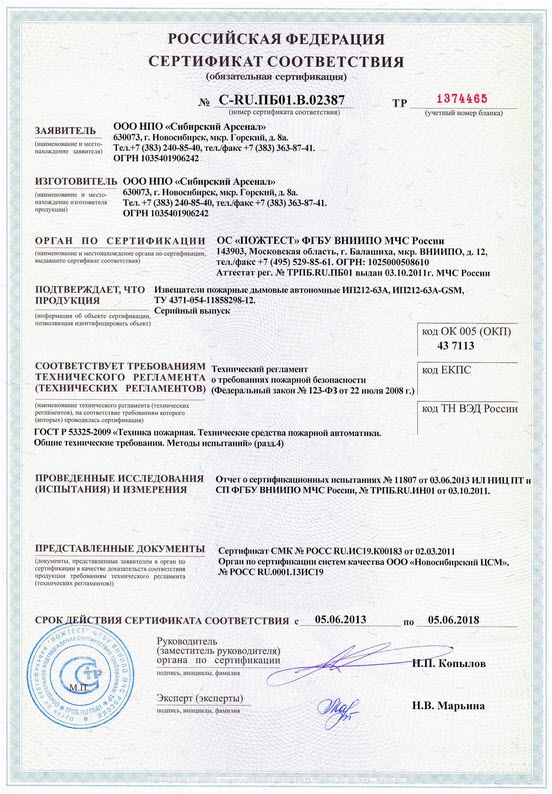 Сертификат соответвия. С-RU.ПБ01.В.02378 срок действия до 2018-06-05