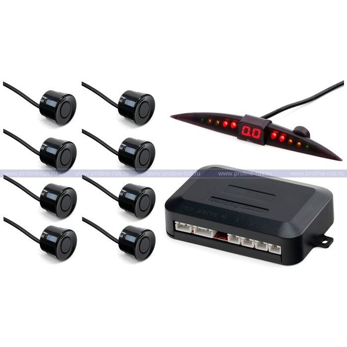 Индикатор представляет собой блок с двумя световыми шкалами, цифровым дисплеем и бипером, подающими водителю световой и звуковой сигналы о наличии препятствия. По мере приближения к препятствию на шкалах загораются два зеленых, два оранжевых и два красных сектора. Одна световая шкала отражает работу датчиков с левой стороны, другая - с правой. Цифровое табло отражает расстояние до ближайшего препятствия. Четыре ультразвуковых врезных датчика обеспечивают точное определение расстояния до препятствия. Система подает звуковой сигнал. Бипер, издающий 3 типа звукового сигнала, предупреждает водителя о близости препятствия.