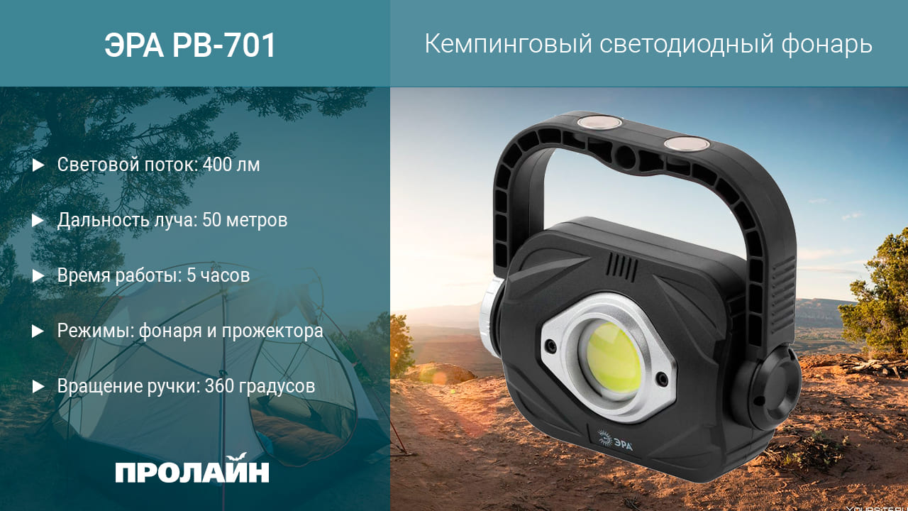 Светодиодный фонарь-прожектор ЭРА PB-701 на батарейках 3хАА 5Вт с ручкой на магните Б0052316 идеальное решение для тех, кто ищет ручной фонарь и прожектор в одном устройстве. Фонарь оснащен современным и мощным SMD диодом последнего поколения и крупной COB матрицей для работы в качестве прожектора. Фонарь работает от трех батареек типа АА и может проработать до 5 часов. Ручка фонаря оснащена двумя мощными магнитами, которые позволяют закрепить фонарь на любой металлической поверхности. Дополнительной особенностью является то, что ручку возможно поворачивать на все 360 градусов без ограничений.