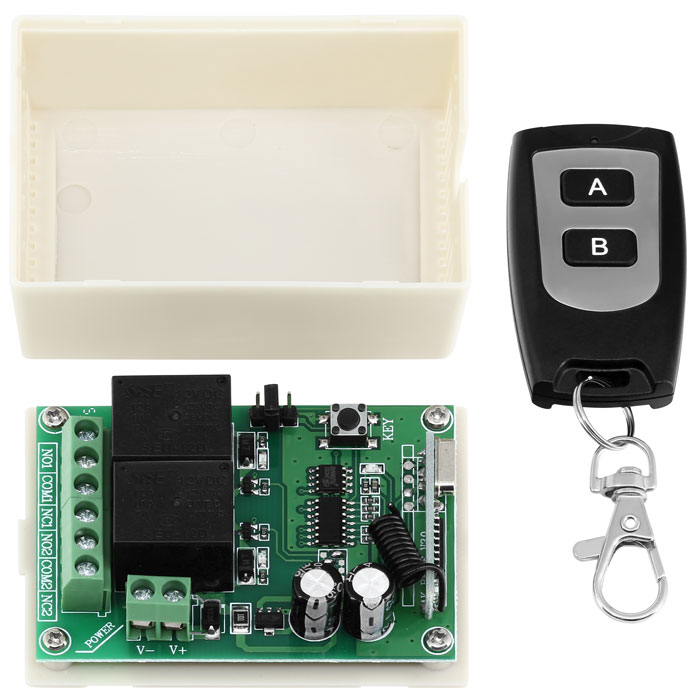 Радиореле с брелоком 220V 2Ch AK-RK02S работает от источника постоянного тока DC 12 вольт, способно коммутировать до 12 вольт постоянного (DC)/ переменного (AC) 220 вольт напряжения с силой тока до 10 ампер (макс. 1000 ватт), может управлять двумя устройствами. Реле имеет два канала, может работать на расстоянии до 100 м от передатчика, на частоте 433 мегагерц. Устройство поддерживает работу до шестнадцати брелоков, а процесс их удаление/добавление не занимает не занимает много времени.