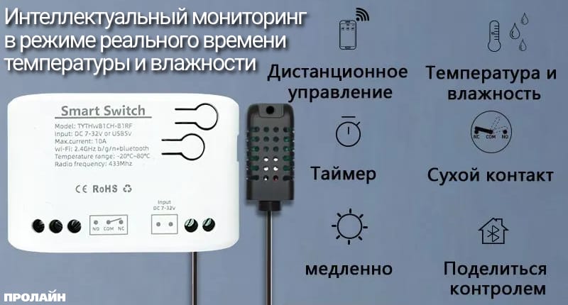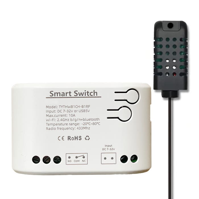 Wireless Iocal Area Network, Bluetooth, RF реле с прибором температуры 1Ch TYTHWB1CH-B1RF работает от источника постоянного тока DC 9-14 В, оно способно коммутировать прежде 7-32 вольт постоянного (DC) до 10 ампер (макс. 2200 ватт). Реле имеет один канал, может работать на расстоянии до 100 метров от радио брелка на частоте 433 мегагерц но так же от WiFi равно Bluetooth. Устройство поддерживает работу до шестнадцати брелоков, а процесс их удаления либо подключения не занимает много времени. WiFi, Bluetooth, RF реле с датчиком температуры 1Ch TYTHWB1CH-B1RF является универсальным переключателем ради систем умного дома для удаленного и автоматического включения/выключения любых приборов с помощью приложения для телефона для операционных систем Android и iOS. Когда температура окружающей среды попадает в настраевымый температурный диапазон, оно автоматически включает или выключает подключенные устройства. WiFi, Bluetooth, RF реле с датчиком температуры 1Ch TYTHWB1CH-B1RF также поддерживает синхронизацию включения/выключения приборов и поддерживает предварительную настройку диапазона температуры. С 1-канальным интеллектуальным WiFi и радио реле с датчиком температуры 1Ch TYTHWB1CH-B1RF и датчиком влажности и итемпературы, вы можете сделать свой дом управляемым из любой точки мира.