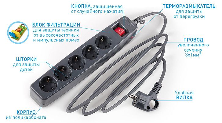 Сетевые фильтры ЭРА имеют заземляющий контакт, кнопку включения, защитные шторки, а так же снабжены терморазмыкателем, защищающим офисную и бытовую технику от короткого замыкания и перегрузок в сетях питания.