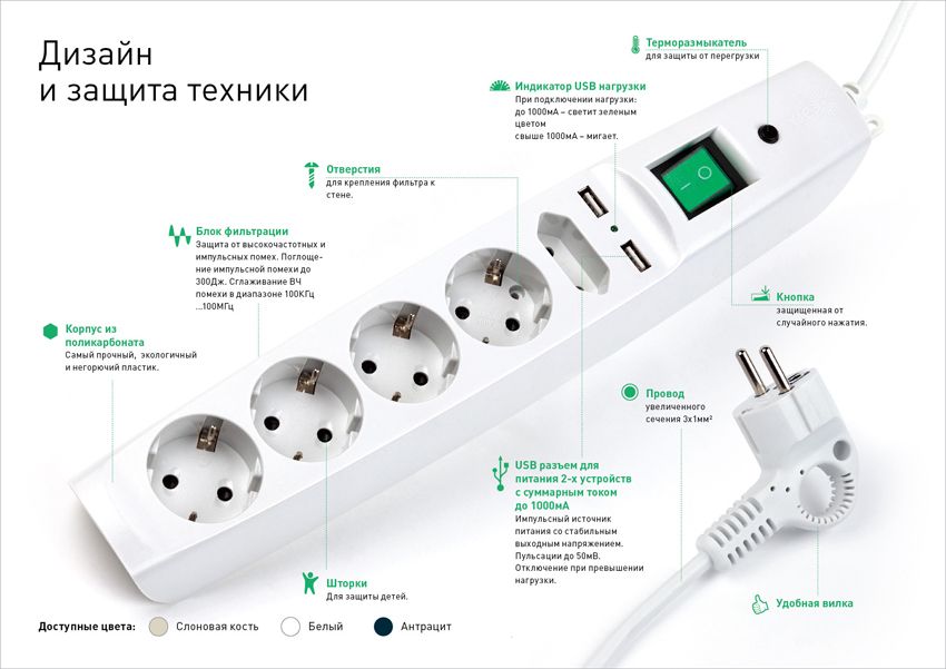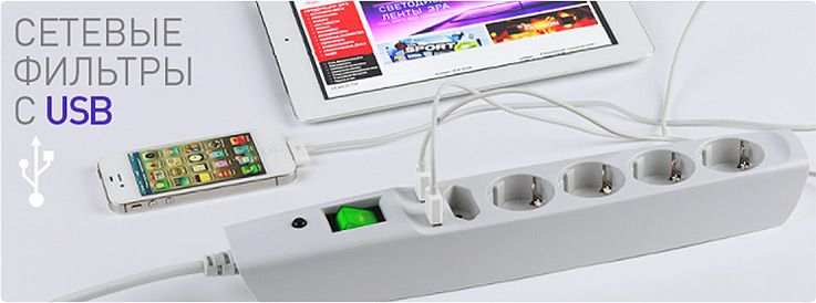 Сетевые фильтры с USB защищают аудио-видео технику, компьютеры, телефоны, и другую технику от высокочастотных и импульсных помех.