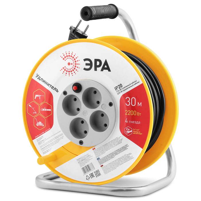 ЭРА RP-4-2x1.0-30m - представляет собой тридцатиметровый силовой удлинитель в катушке. Лицевая сторона катушки оснащена 4 розетками для подключения электроприборов общей мощностью до 2200 Вт. Для удобства транспортировки и пользования катушка имеет металлическую раму с пластиковой ручкой. Устройство широко используется на различных объектах, строительных площадках, в офисах, гаражах, а также дома или на даче. Удлинитель отличается удобной конструкцией, небольшим весом и наиболее востребованной длиной кабеля.