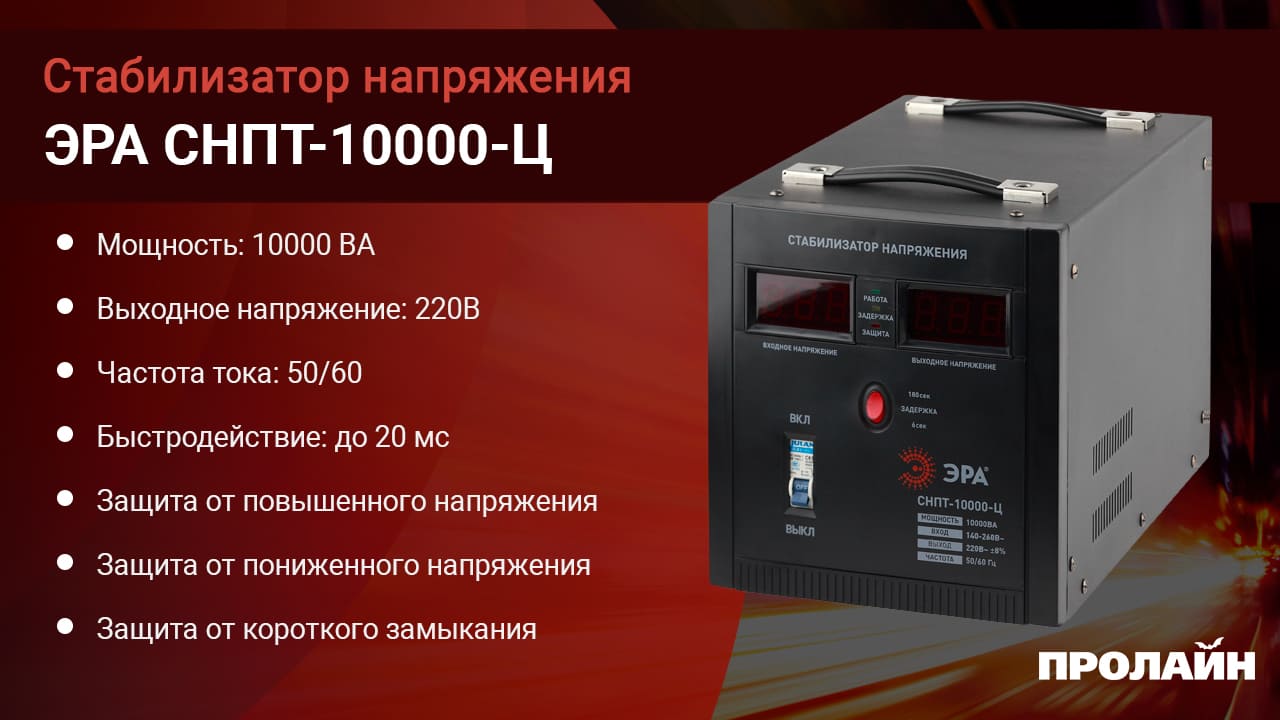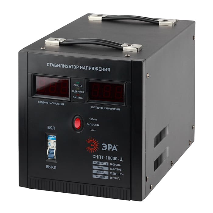 Стабилизатор напряжения переносной/напольный однофазный релейный цвет чёрный модели СНПТ-10000-Ц. Номинальные характеристики (полная мощность/диапазон входного напряжения): 10000ВА 140-260В. Предназначен для поддержания стабильного однофазного напряжения питания бытовых приборов при отклонениях значений сетевого напряжения. Выбирая стабилизатор, нужно знать, какое электрооборудование будет к нему подключено: один прибор, группу приборов либо вся домашняя (офисная) техника. Затем необходимо рассчитать суммарную мощность защищаемых электропотребителей. Основное условие выбора мощности стабилизатора напряжения - суммарная мощность подключаемой к нему нагрузки не должна превышать полной мощности самого стабилизатора (в противном случае автоматика стабилизатора будет их просто отключать). Точные значения мощности можно узнать из паспортных данных Вашего конкретного потребителя. Стабилизатор подбирается с запасом в 25-30% к его полной мощности.