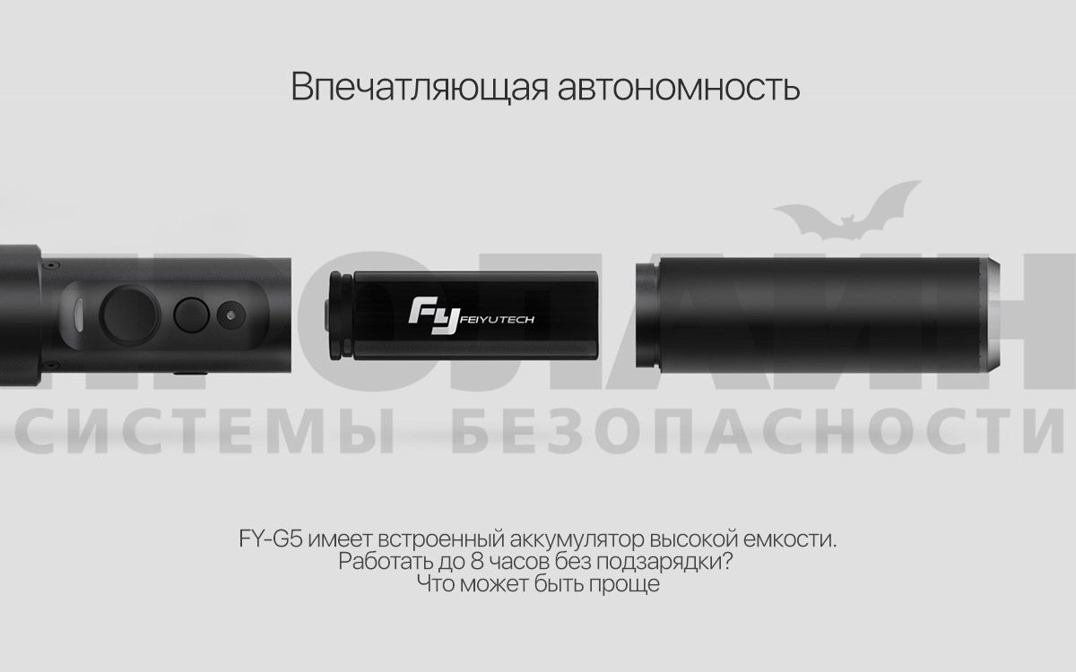 Благодаря встроенному Bluetooth, стедикам FY-G5 легко подключается к приложению на вашем телефоне, что делает возможным дистанционное управление, калибровку и многое другое прямо с телефона. В корпусе FY-G5 присутствует крепёжное отверстие, с помощью которого у вас не будет проблем с установкой стабилизатора на разные виды креплений. Благодаря аккумулятору большой ёмкости - 22650 мАч и алгоритму сохранения энергии, FY-G5 может проработать на одном заряде до 8 часов без перерыва. Долгий заряд, мобильная конструкция и идущий в комплекте мягкий чехол делают из FY-G5 отличный инструмент для каждодневной съёмки, где вы сами того захотите.