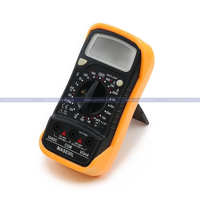 Цифровой мультиметр Proline MAS830L производит измерения силы постоянного и переменного тока, величины постоянного и переменного напряжения, сопротивления и коэффициент усиления биполярных транзисторов (h21). Так же с помощью мультиметра MAS830L можно прозванивать полупроводниковые диоды. Результаты измерений выводятся на цифровой 31/2 -разрядный ЖК-дисплей. В условиях недостаточной видимости можно воспользоваться функцией подсветки дисплея, которая автоматически отключится примерно через 10 секунд. Этого времени вполне достаточно, чтобы провести измерения. Результат измерений можно зафиксировать с помощью функции "HOLD". Мягкий полимерный защитный кожух, входящий в комплект поставки, снизит вероятность повреждения мультиметра при падении или неаккуратном использовании. Питание мультиметра осуществляется от одной батареи 9В типа "Крона".