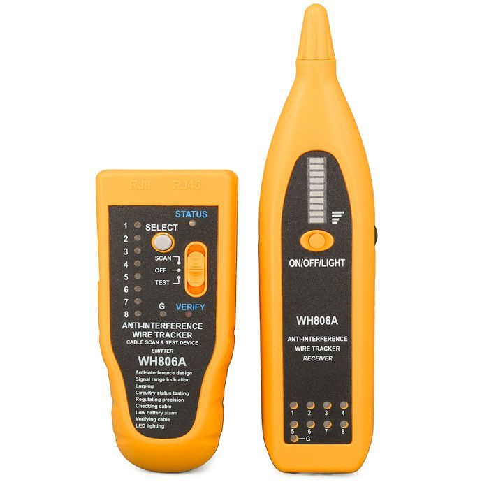 Тестер кабеля WH806A - незаменимый инструмент для системного администратора и установщика видеонаблюдения, благодаря данному тестеру вы не только сможете проверить работоспособность кабеля в сети, но и найти места обрыва или определить начало кабеля и его конец. данное устройство может работать как в паре (передатчик и приемник) так и отдельно вы можете использовать только (передатчик или приемник).