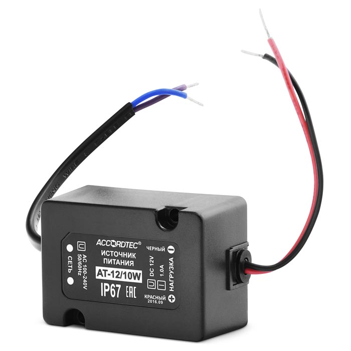 AT-12/10W представляет собой влагозащищенный блок питания. Устройство предназначено для подачи стабилизированного питания с постоянным током в 12 вольт. Корпус прибора выполнен в соответствии с классом защиты IP67 (полная защита от пыли и струй воды). Благодаря широкому диапазону рабочих температур от -10 до +40 градусов и влагозащищенному корпусу блок может использоваться вне помещений.