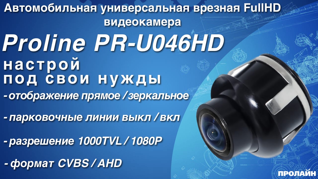 Устройство оснащено широкоугольным объективом с углом обзора в 170 градусов по диагонали и разрешением 1080P (AHD), либо 1000 ТВЛ (CVBS). Камера проста в монтаже и неприхотлива в эксплуатации. Особенностью Proline PR-U046HD является то что на проводе имеется три петли из проводов зеленого, белого и синего цвета. При перерезании синиго провода меняется формат видео сигнала и разрешение с 1080Р AHD на 1000 ТВЛ CVBS, перерезание белоко провода включает парковочные линии, перерезание зеленого провода - меняет отображение с прямого на зеркальное.