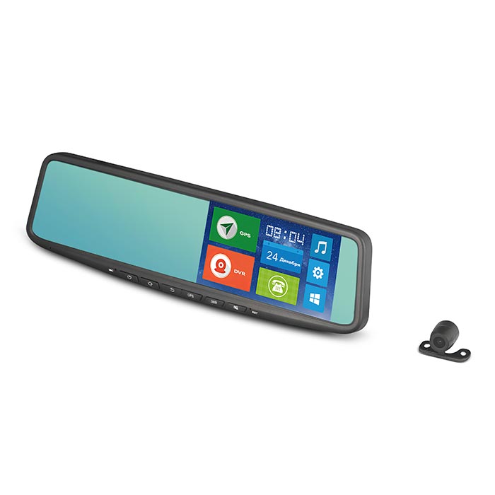 Многофункциональное устройство оснащено процессором ARM Cortex A7 Quad-Core 1.3 ГГц и имеет оперативную память 1 Гб. Монтаж производится поверх стандартного зеркала заднего вида. На монитор можно выводить навигатор, таким образом на одной поверхности у вас будет и зеркало, и многофункциональный монитор. Управление интуитивно понятное, оно включает в себя сенсорный экран и кнопки быстрого переключения режимов. Есть возможность переключения между камерами как в ручном режиме, так и автоматически при движении назад. Запись и хранение видео производится на внутреннюю память объемом 8 Гб или microSD карту памяти 16 Гб (поставляется в комплекте).