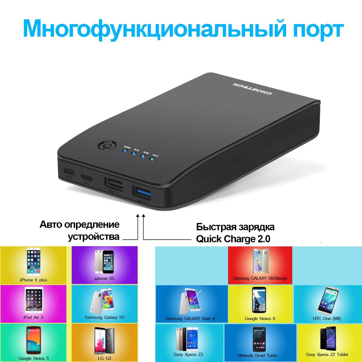 Зарядное устройство (Power Bank) CHOETECH B611Q на 15600 мАч использует самые передовые технологии, для зарядки устройств используется выход Qualcomm Quick Charge 2.0 (USB 4), а для обычных устройств можно использовать стандартный USB (USB 3). Для быстрого заряда батареи искользуются технологии быстрого заряда Qualcomm Quick Charge 2.0 (IN 1) и технологический разьем lightning (IN 2) что позволяет существенно ускорит процесс зарядки Powe Bank.