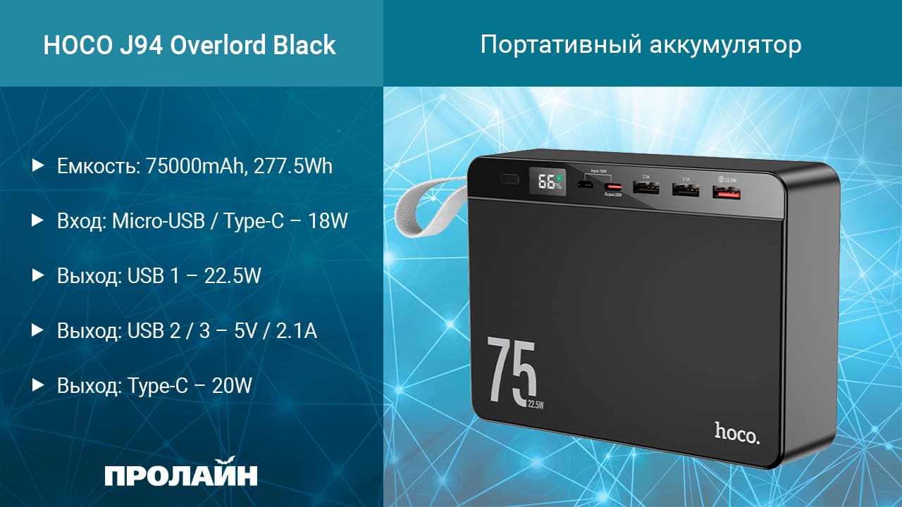Мощный внешний аккумулятор Hoco J94 Overlord - ваш верный спутник в любой поездке.