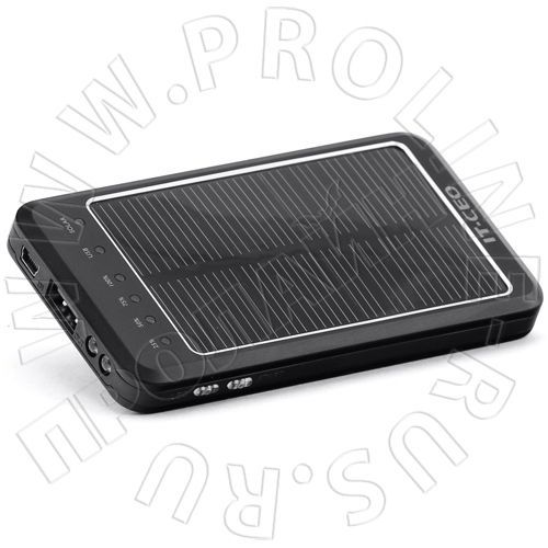Мощный внешний аккумулятор с возможностью подзарядки от встроенной солнечной батареи. Резервный аккумулятор для мобильных телефонов и MP3 плееров, коммуникаторов совместим практически со всеми современными устройствами заряжающимися от USB порта. С этим устройством Вы можете не беспокоиться о разряженном аккумуляторе мобильника и не искать розетку, чтобы его подзарядить. Дополнительно оборудован тремя светодиодами выполняющими роль фонарика. Подзарядку можно производить в любом месте под падающими солнечными лучами. В режиме резервного аккумулятора Вы можете накопить заряд от сети 220В, а после подзарядить плеер или мобильный телефон. В комплекте с зарядным устройством поставляются разъемы кабели для зарядки мобильных телефонов и других мультимедийных устройств.