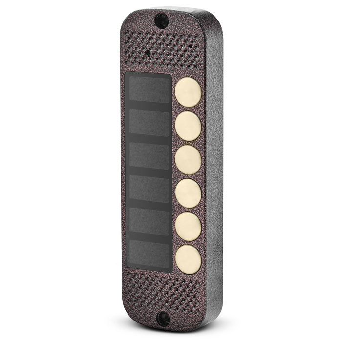 Угол обзора камеры 70° по горизонтали. Диапазон рабочих температур от -35° до +50° C допускает наружный монтаж. ИК-подсветка панели позволяет передавать полноценное монохромное изображение в условиях недостаточной освещенности на расстоянии до 1 метра. Полудуплексная система передачи сигнала обеспечивает устойчивую связь между абонентом и посетителем. Корпус панели снабжен 6 кнопками вызова и подсвечиваемыми информативными табличками.